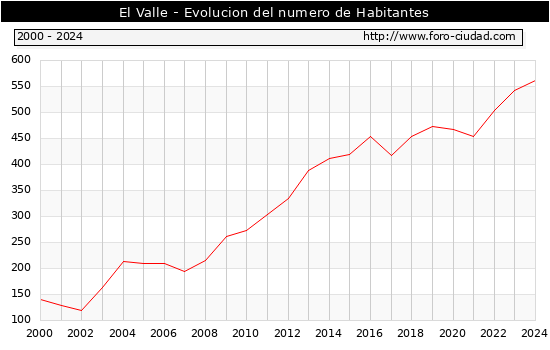 el numero de habitantes en El Valle era de 561, 18 habitantes mas que el en el año 2023. En el grafico siguiente se puede ver cuantos habitantes tiene El Valle a lo largo de los años.
