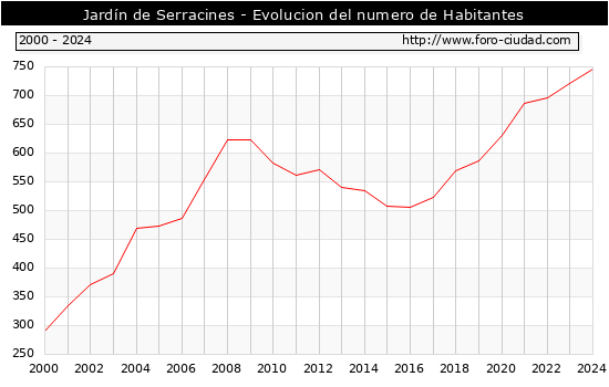 el numero de habitantes en Jardín de Serracines era de 746, 24 habitantes mas que el en el año 2023. En el grafico siguiente se puede ver cuantos habitantes tiene Jardín de Serracines a lo largo de los años.