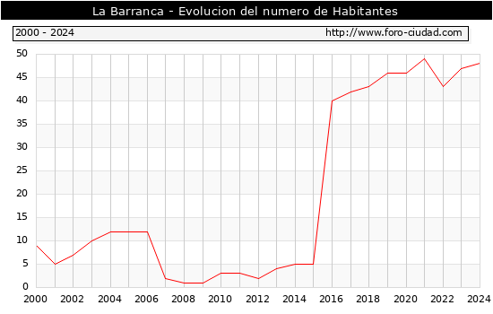 el numero de habitantes en La Barranca era de 48, 1 habitantes mas que el en el año 2023. En el grafico siguiente se puede ver cuantos habitantes tiene La Barranca a lo largo de los años.