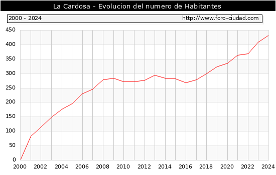 el numero de habitantes en La Cardosa era de 432, 23 habitantes mas que el en el año 2023. En el grafico siguiente se puede ver cuantos habitantes tiene La Cardosa a lo largo de los años.