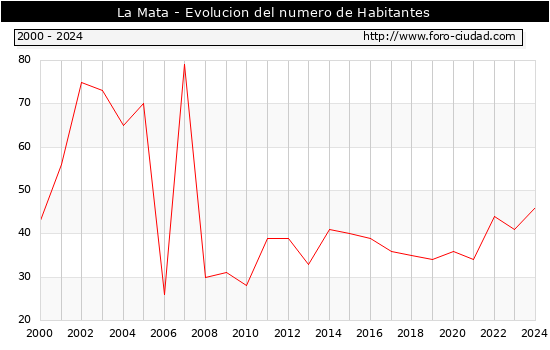el numero de habitantes en La Mata era de 46, 5 habitantes mas que el en el año 2023. En el grafico siguiente se puede ver cuantos habitantes tiene La Mata a lo largo de los años.