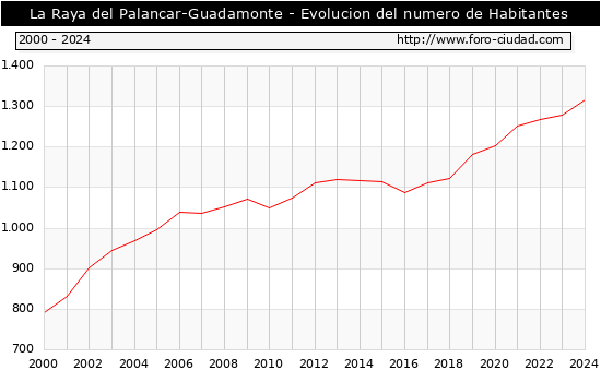 el numero de habitantes en La Raya del Palancar-Guadamonte era de 1.316, 37 habitantes mas que el en el año 2023. En el grafico siguiente se puede ver cuantos habitantes tiene La Raya del Palancar-Guadamonte a lo largo de los años.