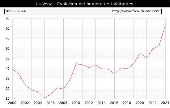 el numero de habitantes en La Vega era de 84, 21 habitantes mas que el en el año 2023. En el grafico siguiente se puede ver cuantos habitantes tiene La Vega a lo largo de los años.