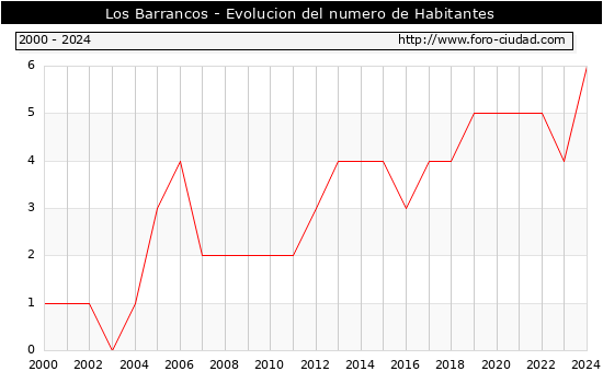 el numero de habitantes en Los Barrancos era de 6, 2 habitantes mas que el en el año 2023. En el grafico siguiente se puede ver cuantos habitantes tiene Los Barrancos a lo largo de los años.