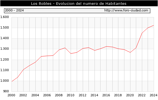 el numero de habitantes en Los Robles era de 1.525, 25 habitantes mas que el en el año 2023. En el grafico siguiente se puede ver cuantos habitantes tiene Los Robles a lo largo de los años.
