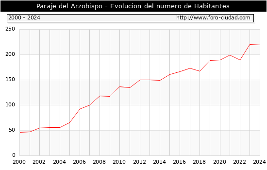 el numero de habitantes en Paraje del Arzobispo era de 219, 1 habitantes menos que el en el año 2023. En el grafico siguiente se puede ver cuantos habitantes tiene Paraje del Arzobispo a lo largo de los años.