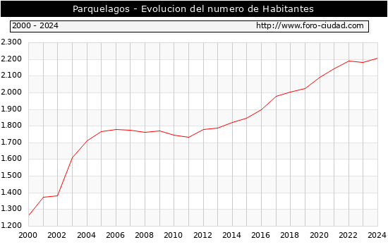 el numero de habitantes en Parquelagos era de 2.207, 25 habitantes mas que el en el año 2023. En el grafico siguiente se puede ver cuantos habitantes tiene Parquelagos a lo largo de los años.
