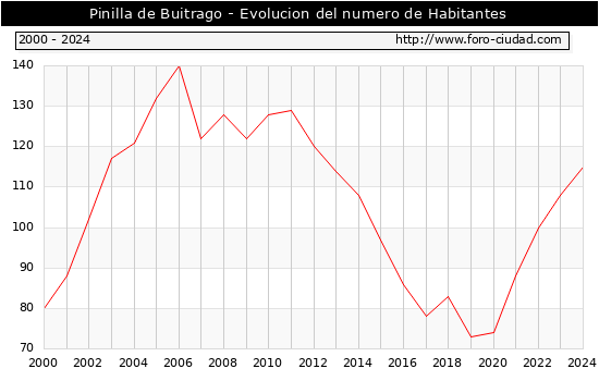 el numero de habitantes en Pinilla de Buitrago era de 115, 7 habitantes mas que el en el año 2023. En el grafico siguiente se puede ver cuantos habitantes tiene Pinilla de Buitrago a lo largo de los años.