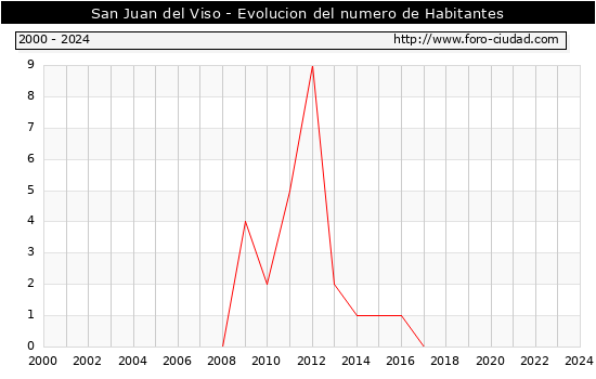 el numero de habitantes en San Juan del Viso era de 0, igual numero de habitantes que el en el año 2023. En el grafico siguiente se puede ver cuantos habitantes tiene San Juan del Viso a lo largo de los años.