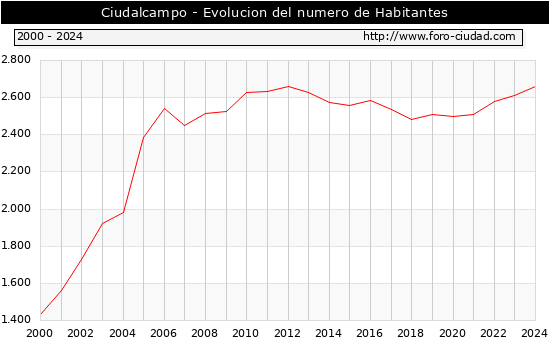el numero de habitantes en Ciudalcampo era de 2.662, 50 habitantes mas que el en el año 2023. En el grafico siguiente se puede ver cuantos habitantes tiene Ciudalcampo a lo largo de los años.