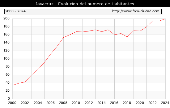 el numero de habitantes en Javacruz era de 200, 6 habitantes mas que el en el año 2023. En el grafico siguiente se puede ver cuantos habitantes tiene Javacruz a lo largo de los años.