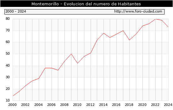 el numero de habitantes en Montemorillo era de 73, 6 habitantes menos que el en el año 2023. En el grafico siguiente se puede ver cuantos habitantes tiene Montemorillo a lo largo de los años.