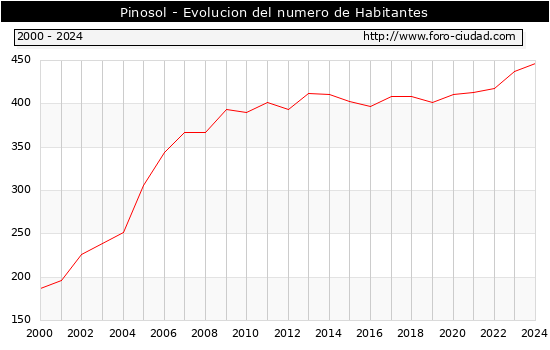 el numero de habitantes en Pinosol era de 447, 10 habitantes mas que el en el año 2023. En el grafico siguiente se puede ver cuantos habitantes tiene Pinosol a lo largo de los años.