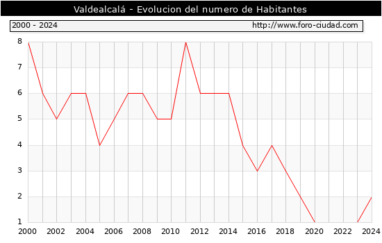 el numero de habitantes en Valdealcalá era de 2, 1 habitantes mas que el en el año 2023. En el grafico siguiente se puede ver cuantos habitantes tiene Valdealcalá a lo largo de los años.