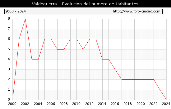el numero de habitantes en Valdeguerra era de 0, 1 habitantes menos que el en el año 2023. En el grafico siguiente se puede ver cuantos habitantes tiene Valdeguerra a lo largo de los años.