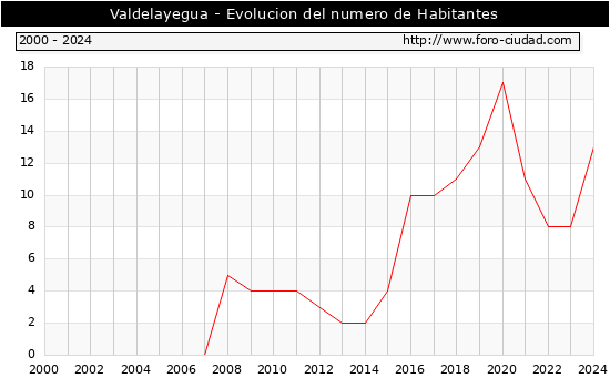 el numero de habitantes en Valdelayegua era de 13, 5 habitantes mas que el en el año 2023. En el grafico siguiente se puede ver cuantos habitantes tiene Valdelayegua a lo largo de los años.