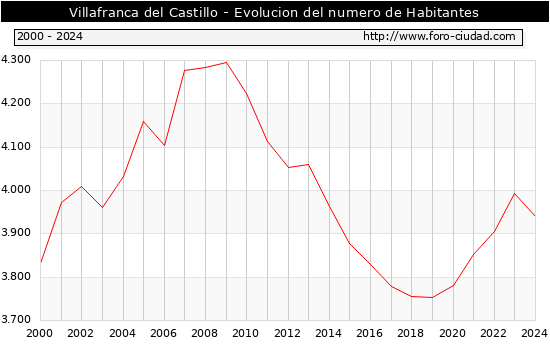 el numero de habitantes en Villafranca del Castillo era de 3.939, 54 habitantes menos que el en el año 2023. En el grafico siguiente se puede ver cuantos habitantes tiene Villafranca del Castillo a lo largo de los años.
