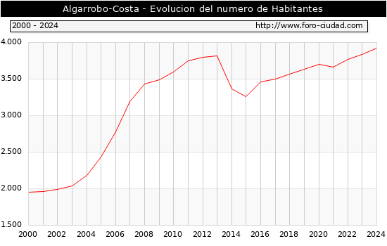 el numero de habitantes en Algarrobo-Costa era de 3.919, 86 habitantes mas que el en el año 2023. En el grafico siguiente se puede ver cuantos habitantes tiene Algarrobo-Costa a lo largo de los años.