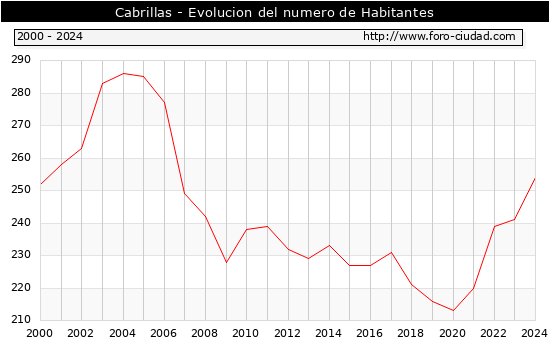 el numero de habitantes en Cabrillas era de 254, 13 habitantes mas que el en el año 2023. En el grafico siguiente se puede ver cuantos habitantes tiene Cabrillas a lo largo de los años.