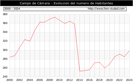 el numero de habitantes en Campo de Cámara era de 299, 14 habitantes mas que el en el año 2023. En el grafico siguiente se puede ver cuantos habitantes tiene Campo de Cámara a lo largo de los años.