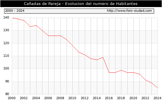 el numero de habitantes en Cañadas de Pareja era de 85, 4 habitantes menos que el en el año 2023. En el grafico siguiente se puede ver cuantos habitantes tiene Cañadas de Pareja a lo largo de los años.