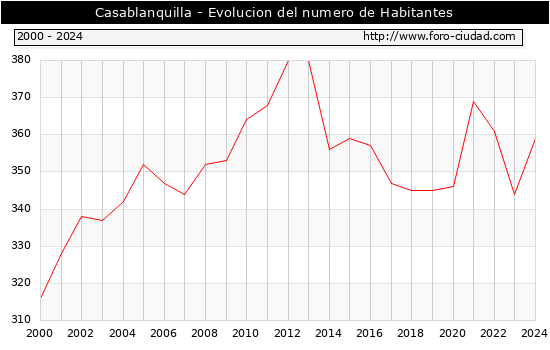 el numero de habitantes en Casablanquilla era de 359, 15 habitantes mas que el en el año 2023. En el grafico siguiente se puede ver cuantos habitantes tiene Casablanquilla a lo largo de los años.