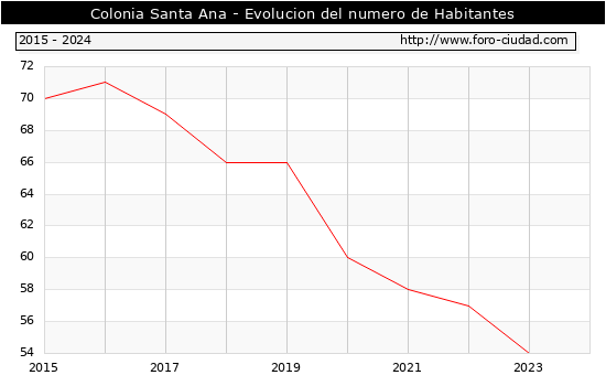 Segun los datos publicados por el INE a 1 de Enero de 2024 el numero de habitantes en Colonia Santa Ana era de 54, igual numero de habitantes que el en el año 2023. En el grafico siguiente se puede ver cuantos habitantes tiene Colonia Santa Ana a lo largo de los años.