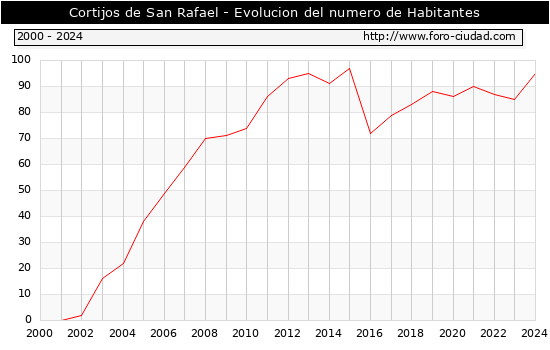 el numero de habitantes en Cortijos de San Rafael era de 95, 10 habitantes mas que el en el año 2023. En el grafico siguiente se puede ver cuantos habitantes tiene Cortijos de San Rafael a lo largo de los años.