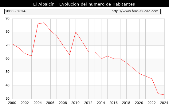 Segun los datos publicados por el INE a 1 de Enero de 2024 el numero de habitantes en El Albaicín era de 33, 1 habitantes menos que el en el año 2023. En el grafico siguiente se puede ver cuantos habitantes tiene El Albaicín a lo largo de los años.