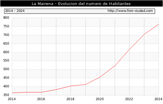 el numero de habitantes en La Mairena era de 763, 58 habitantes mas que el en el año 2023. En el grafico siguiente se puede ver cuantos habitantes tiene La Mairena a lo largo de los años.
