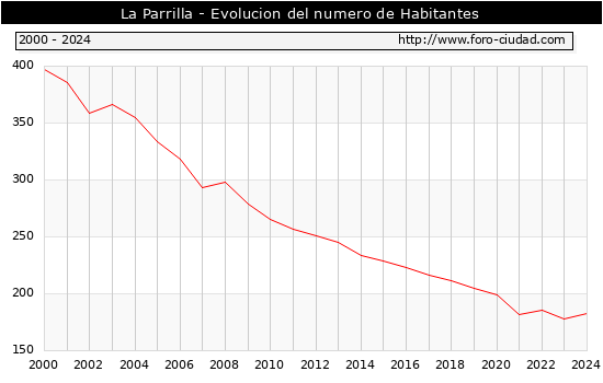 el numero de habitantes en La Parrilla era de 183, 5 habitantes mas que el en el año 2023. En el grafico siguiente se puede ver cuantos habitantes tiene La Parrilla a lo largo de los años.