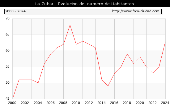 el numero de habitantes en La Zubia era de 63, 8 habitantes mas que el en el año 2023. En el grafico siguiente se puede ver cuantos habitantes tiene La Zubia a lo largo de los años.