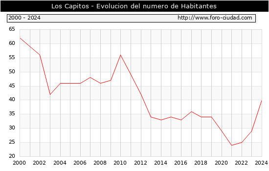el numero de habitantes en Los Capitos era de 40, 11 habitantes mas que el en el año 2023. En el grafico siguiente se puede ver cuantos habitantes tiene Los Capitos a lo largo de los años.