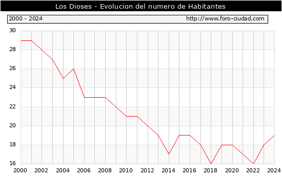 el numero de habitantes en Los Dioses era de 19, 1 habitantes mas que el en el año 2023. En el grafico siguiente se puede ver cuantos habitantes tiene Los Dioses a lo largo de los años.