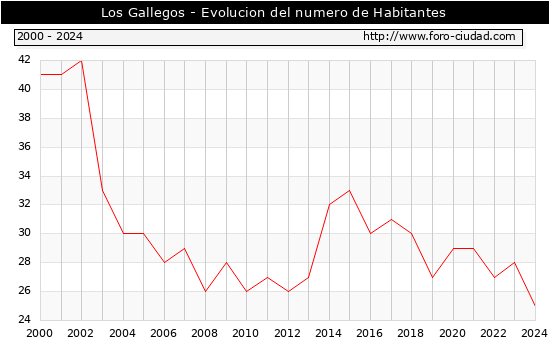 el numero de habitantes en Los Gallegos era de 25, 3 habitantes menos que el en el año 2023. En el grafico siguiente se puede ver cuantos habitantes tiene Los Gallegos a lo largo de los años.