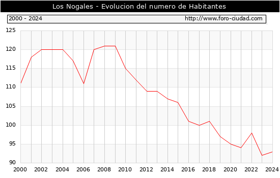 el numero de habitantes en Los Nogales era de 93, 1 habitantes mas que el en el año 2023. En el grafico siguiente se puede ver cuantos habitantes tiene Los Nogales a lo largo de los años.