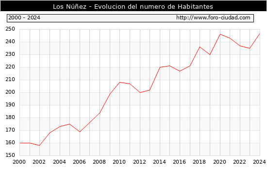 el numero de habitantes en Los Núñez era de 247, 12 habitantes mas que el en el año 2023. En el grafico siguiente se puede ver cuantos habitantes tiene Los Núñez a lo largo de los años.