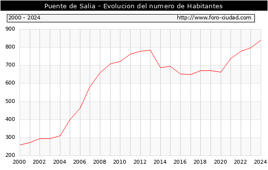 Segun los datos publicados por el INE a 1 de Enero de 2024 el numero de habitantes en Puente de Salia era de 841, 44 habitantes mas que el en el año 2023. En el grafico siguiente se puede ver cuantos habitantes tiene Puente de Salia a lo largo de los años.