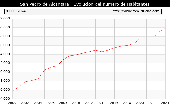 el numero de habitantes en San Pedro de Alcántara era de 40.012, 1.030 habitantes mas que el en el año 2023. En el grafico siguiente se puede ver cuantos habitantes tiene San Pedro de Alcántara a lo largo de los años.