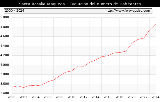 el numero de habitantes en Santa Rosalía-Maqueda era de 4.865, 122 habitantes mas que el en el año 2023. En el grafico siguiente se puede ver cuantos habitantes tiene Santa Rosalía-Maqueda a lo largo de los años.