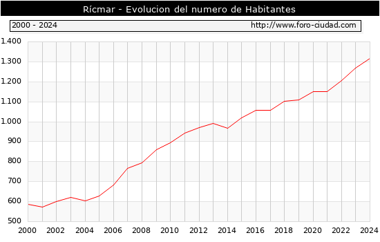 el numero de habitantes en Rícmar era de 1.318, 51 habitantes mas que el en el año 2023. En el grafico siguiente se puede ver cuantos habitantes tiene Rícmar a lo largo de los años.