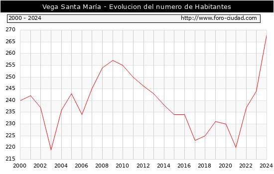 el numero de habitantes en Vega Santa María era de 268, 24 habitantes mas que el en el año 2023. En el grafico siguiente se puede ver cuantos habitantes tiene Vega Santa María a lo largo de los años.
