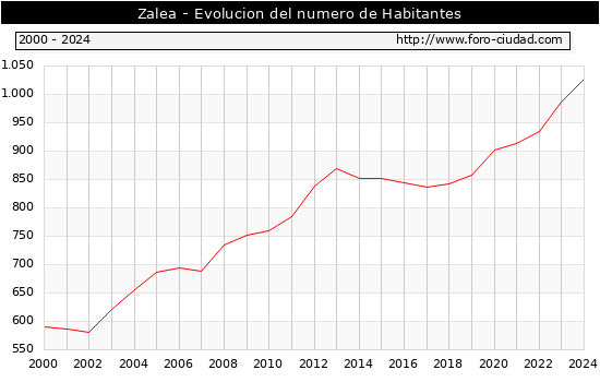 el numero de habitantes en Zalea era de 1.027, 41 habitantes mas que el en el año 2023. En el grafico siguiente se puede ver cuantos habitantes tiene Zalea a lo largo de los años.