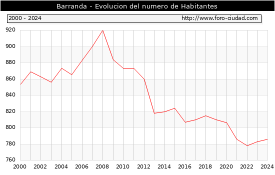 el numero de habitantes en Barranda era de 786, 3 habitantes mas que el en el año 2023. En el grafico siguiente se puede ver cuantos habitantes tiene Barranda a lo largo de los años.
