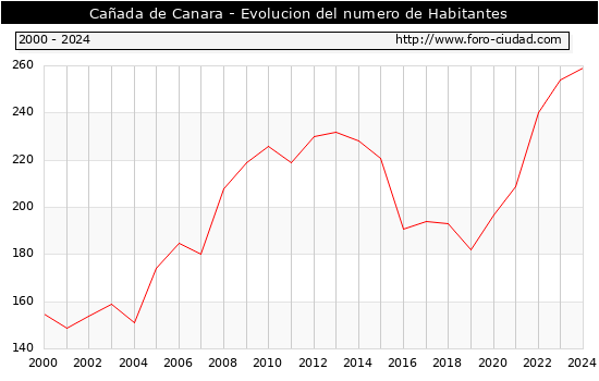 el numero de habitantes en Cañada de Canara era de 259, 5 habitantes mas que el en el año 2023. En el grafico siguiente se puede ver cuantos habitantes tiene Cañada de Canara a lo largo de los años.