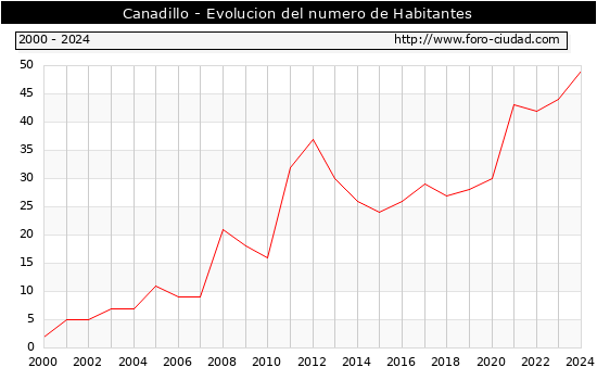 el numero de habitantes en Canadillo era de 49, 5 habitantes mas que el en el año 2023. En el grafico siguiente se puede ver cuantos habitantes tiene Canadillo a lo largo de los años.
