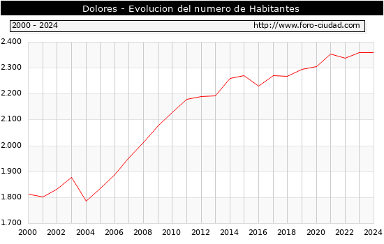 Segun los datos publicados por el INE a 1 de Enero de 2024 el numero de habitantes en Dolores era de 2.359, 1 habitantes menos que el en el año 2023. En el grafico siguiente se puede ver cuantos habitantes tiene Dolores a lo largo de los años.