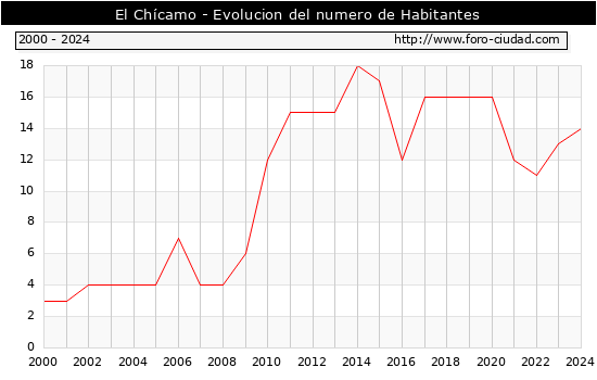 Segun los datos publicados por el INE a 1 de Enero de 2024 el numero de habitantes en El Chícamo era de 14, 1 habitantes mas que el en el año 2023. En el grafico siguiente se puede ver cuantos habitantes tiene El Chícamo a lo largo de los años.