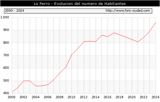 el numero de habitantes en Lo Ferro era de 962, 71 habitantes mas que el en el año 2023. En el grafico siguiente se puede ver cuantos habitantes tiene Lo Ferro a lo largo de los años.