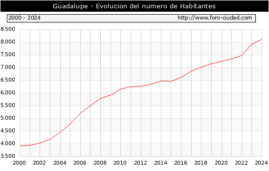 el numero de habitantes en Guadalupe era de 8.111, 189 habitantes mas que el en el año 2023. En el grafico siguiente se puede ver cuantos habitantes tiene Guadalupe a lo largo de los años.